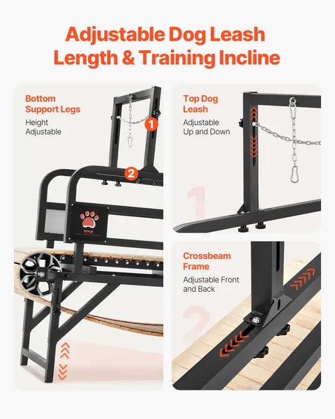 4.Easy to Install and Adjust: Pre-drilled for quick assembly in about 20 minutes without special tools. This dog excercise treadmill comes with adjustable top leash and crossbeam position, along with height-adjustable legs, that accommodate various pet sizes.