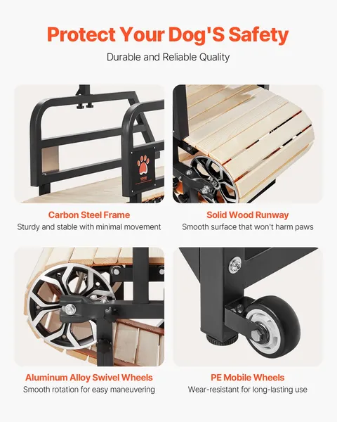 3.Sturdy and Durable Structure: Built with a robust carbon steel frame for stability, our dog running machine features a smooth wooden track that won't harm your dog's paws. The aluminum rollers provide high-intensity training safety, and two wheels allow for easy movement.